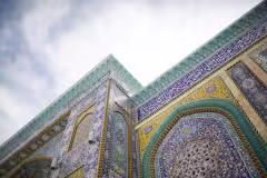 جزء من السور الخارجي لضريح المولى ابا الفضل العباس عليه لسلام يبين جمال الكاشي الكربلائي والزخارف الاسلامية الملونة والاقواس والاشكال الهندسية المتنوعة. 23 رمضان 1441 هـ / 2020 م ، كربلاء المقدسة ، العراق.
