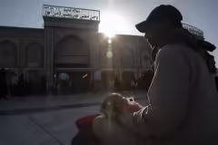 رجل يجلس مابين الحرمين الشريفين وبين احضانه طفله الصغير