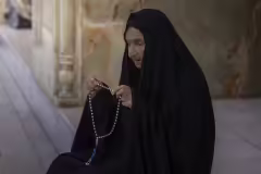 امرأه كبيره في السن تجلس وتعد التسبيحات في مسبحتها التي تعتبرها من اساسيات مقتنياتها كونها تقربها الى الله بالتسبيح والاستغفار والصلوات