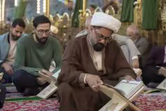 شيخ معمم وطالب للعلم يجلس ليحضر ويستمع للختمة القرآنية المباركة التي تقيمها العتبة العباسية المقدسة في صحن ابي الفضل العباس (عليه السلام) ٤ رمضان ١٤٤٥ هـ / ١٥ آذار ٢٠٢٤ م كربلاء المقدسة ، العراق