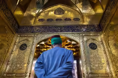احد السادة السدنة خدمة المولى ابي ابي الفضل العباس (عليه السلام) يقف بكل اجلال واحترام قبالة الحضرة الطاهرة وباب قبلتها الشريف ٢٥ ربيع الآخر ١٤٤٧هـ كربلاء المقدسة/العراق