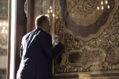 شخصٌ يهيم بتقبيل باب أبي الفضل العباس (عليه السلام) يلامس بجبينه باب العتبة كمن يبحث عن ملاذٍ يغمر قلبه بالسكينة كربلاء المقدسة / العراق