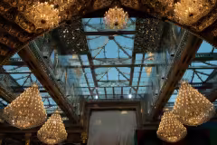 الثرياتُ الضخمةُ تتدلى كعناقيدَ من النور، تُزيّنُ السقفَ الزجاجيَ العاكس، فيبدو الصحنُ وكأنهُ قاعةُ احتفالٍ سماوي، تليقُ بعظمةِ قمرِ بني هاشم (عليه السلام) المكان:صحن المولى ابي الفضل العباس (عليه السلام) كربلاء المقدسة / العراق