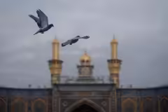 وسطَ الضبابِ المغبش، تتصاعدُ منارتا العباس (عليه السلام) وبرجُ الساعةِ بجوارِ بابِ القبلةِ المهيب، بينما تخترقُ حلقتانِ من حمامِ الحضرةِ الغشاوةَ، في مشهدٍ يمزجُ بينَ هيبةِ البناءِ وجماليةِ الحركةِ والغموض كربلاء المقدسة / العراق