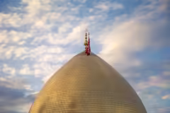 يستقرُ الذهبُ الثمينُ في بناءِ القبةِ المُتقن، وفوقَ هذا البهاءِ، تنهضُ الرايةُ المرتفعةُ لتمثّلَ لواءَ العباس (عليه السلام) الذي لم يسقط، رمزاً للبطولةِ والمنعةِ في هذا المقامِ المبارك كربلاء المقدسة / العراق