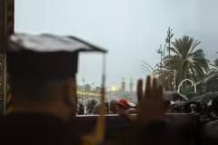 بزيِّ التخرجِ المهيبِ الذي ما زالَ يرتديه، يقفُ الخريجُ الشابُ أمامَ شباكِ العباس (عليه السلام)، لحظةُ تضرعٍ صادقةٍ يودعُ فيها مرحلةً ويبدأُ أخرى، مُنيراً طريقَهُ ببركةِ هذا المقامِ الطاهر كربلاء المقدسة / العراق