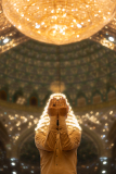 زائر واقف في الصحن العباسي المقدس، يرفع يديه بالقنوت للدعاء، وجهه مغمور بخشوع، وفوقه تتلألأ الثريات والإنارة، فتنساب الأشعة على المكان وكأن الدعاء يعلو مع الضوء، في لحظةٍ تتجلى فيها الروحانية والهيبة معًا. كربلاء المقدسة / العراق