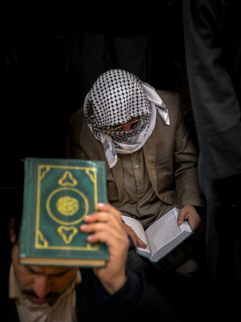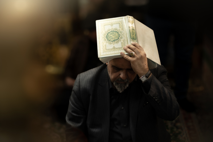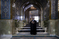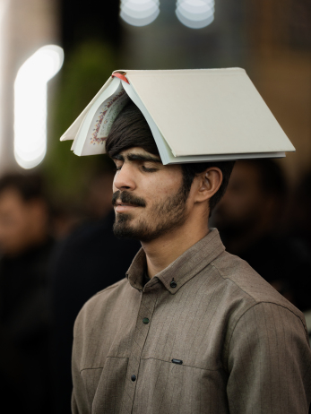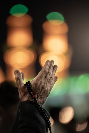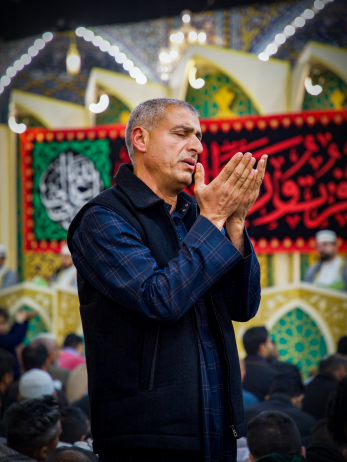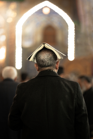 معمم عبر باب الكف لأبي الفضل العباس(عليه السلام)، يرفع يده بالسلام، فتتجسد في لحظةٍ صامتة مشاعر الوفاء والخشوع تجاه المرقد الطاهر كربلاء المقدسة / العراق