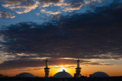 تتوهّج قبة ومنارتي أبي عبد الله الحسين بضوء الفجر الأول، فتختلط أشعة الصباح بالذهب، ويبدو المكان وكأن قداسة اللحظة تشرق مع شروق الشمس، مشهدٌ يفيض أملًا وطمأنينة كربلاء المقدسة / العراق