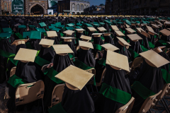 صورة جوية تظهر احتشاد طالبات الكفيل في حفل تخرجهن العاشر أمام باب القبلة لحضرة أبي الفضل العباس (عليه السلام)، بتنسيق منظم يعكس الانضباط وروح الانتماء والهيبة كربلاء المقدسة / العراق