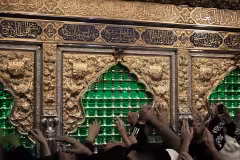 شباكُ أبي الفضل العباس (عليه السلام) تحيط به جموعُ الزائرين محتشدين بخشوع، تتعالى الأدعية وتغمر المكان أجواء الإيمان والسكينة كربلاء المقدسة / العراق