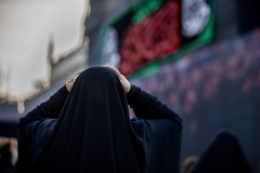 تقفُ المرأةُ بـِ هيئةِ التوجّعِ والأسى، ووضعُ يدِها على رأسِها هو لغةُ الجسدِ التي تختصرُ قروناً من الحزن على ما جرى على السيدةِ زينبَ (عليها السلام) كربلاء المقدسة/العراق