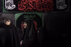 امرأةٌ ترفع يديها قرب مظاهر الحزن في ذكرى وفاة السيدة زينب (عليها السلام)، تتضرع بالدعاء ويغمرها الأسى والخشوع كربلاء المقدسة / العراق