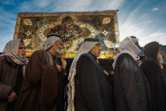 يحملون النعش الرمزي للسيدة زينب (عليها السلام)بوقارٍ وخشوع، تتقدّم خطواتهم ببطءٍ يليق بالمصاب، وكأن النعش ليس رمزيًا بل أمانة حزنٍ وصبرٍ عظيم تُجسّد ذكرى الفاجعة والوفاء كربلاء المقدسة / العراق