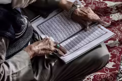 رجلٌ كبيرٌ في السن، بدت على يديه تجاعيد العمر، يجلس يقرأ القرآن بخشوع في الحضرة الطاهرة، في مشهدٍ يفيض وقارًا وإيمانًا كربلاء المقدسة / العراق
