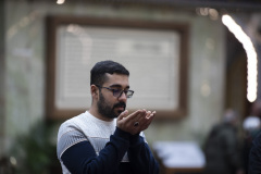 في لحظةٍ مفعمةٍ بالخشوع والتضرّع زائرٌ في الحضرة العباسية المقدسة يقف للصلاة رافعًا يديه بالدعاء كربلاء المقدسة / العراق