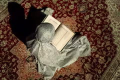 في صورةٍ تجمع البراءة بالإيمان وهدوء المكان طفلةٌ في الحضرة الطاهرة تقرأ القرآن بخشوع، كربلاء المقدسة / العراق