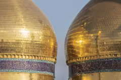 قبّتا الإمامين الكاظمين (عليهما السلام) عن قرب تتلألآن بزخارفهما الذهبية، وتشعّان هيبةً وروحانيةً تأسر القلوب كربلاء المقدسة / العراق