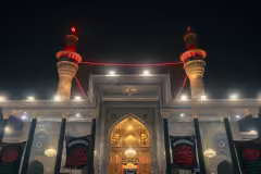 المنارتين وباب من ابواب الحضرة الكاظمية تتزين بالنقوش والزخارف المتقنة، في مشهدٍ يجمع الهيبة والجمال والروحانية كربلاء المقدسة / العراق
