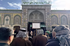 موكبُ عزاءٍ وأعلامٌ مرفوعة فيما بين الحرمين الشريفين بذكرى استشهاد الإمام الكاظم (عليه السلام)، في أجواءٍ يخيّم عليها الحزن والولاء كربلاء المقدسة / العراق