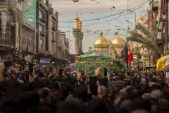 النعشُ الرمزي للإمام الكاظم (عليه السلام) يتقدّم الصحن الطاهر وسط احتشاد المعزّين وأجواء الحزن والمواساة كربلاء المقدسة / العراق