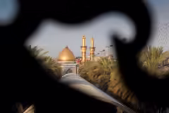 التوسعة الجديدة لحرم الأمام الحسين عليه السلام ، تظهر قبة ومآذنتي أبي الفضل العباس عليه السلام ، 15 شوال 1437 هـ - 2016 م كربلاء المقدسة ، العراق.